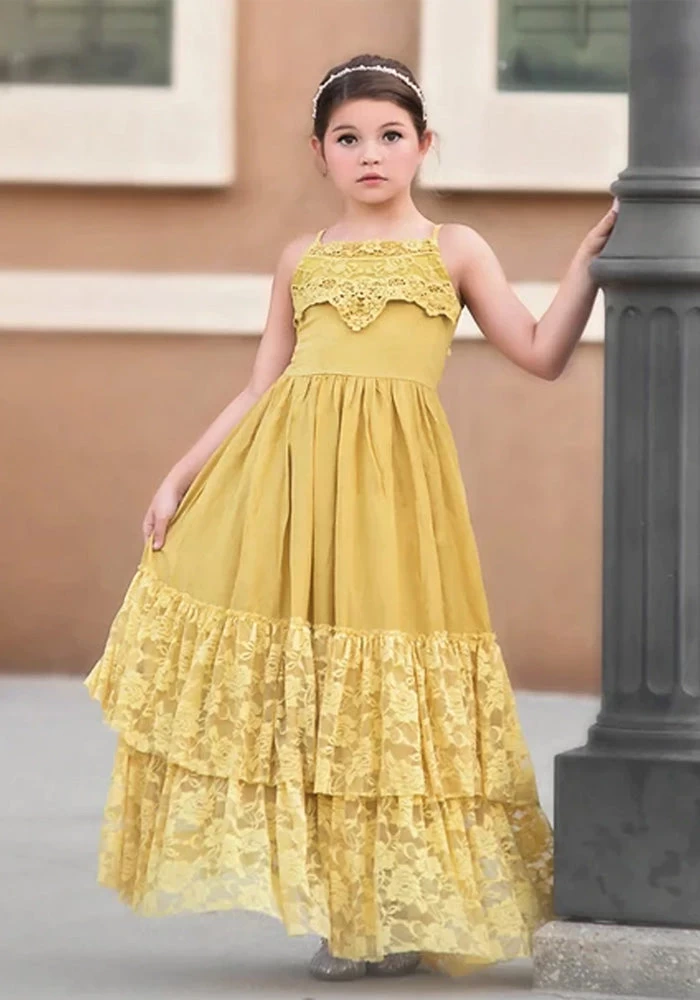 Simply stunning, this gown is just as pretty coming as it is going! This stretch cotton jersey dress will have your girl in a twirl. From the crochet bodice down to the lace ruffled hem, twirl her around to find a sweet tie back, for just the right fit. This soft, stretchy cotton is perfectly comfortable and machine washable.