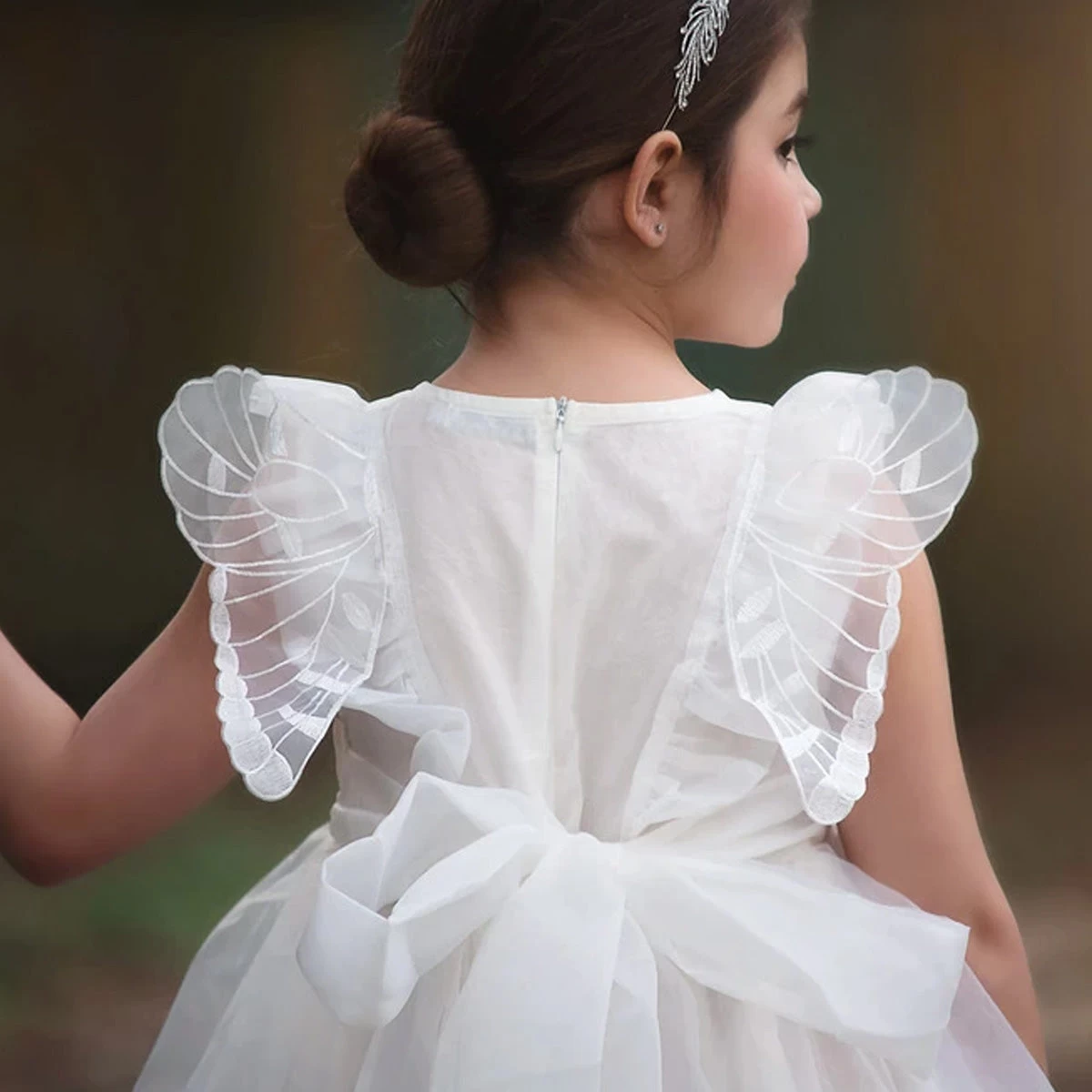 Sweetness has just flown in and she’s wearing our Alice dress with butterfly wings! The perfect combination of pleating and ruffles, this poly organza dress also comes with whimsically placed butterfly wings and a big self tie bow in back. She will be the talk of the town in this sweet frock. 100% poly self, 100% soft cotton lining. Machine wash, hang dry.Â