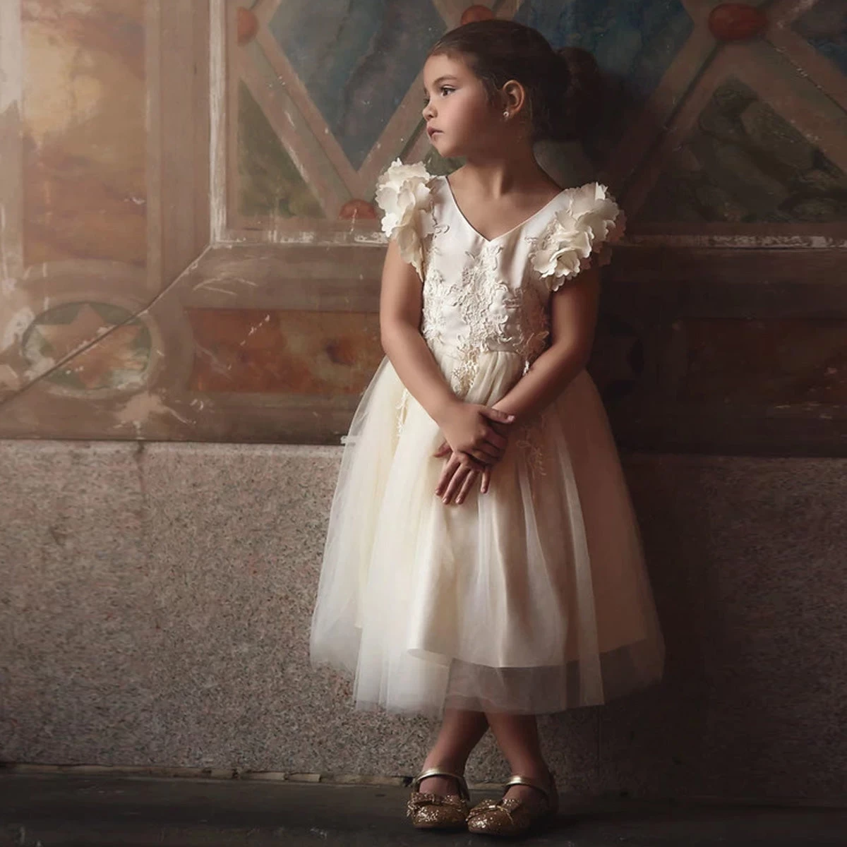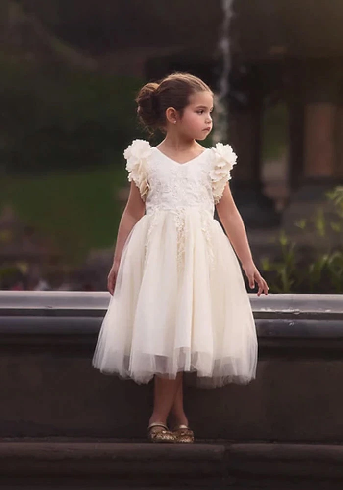 Fit for a princess, this dress has it all. Â Soft off white satin graced with a touch of lace, this dress is a showstopper! Â Sleeves are embellished with whimsical die cut flowers that will have all eyes on her. Â Tulling overlay skirt adds just the right touch of fullness and twirl. Â Fully lined with soft cotton, back zip. Â 100% poly self, 100% cotton lining. Machine wash, hang dry.