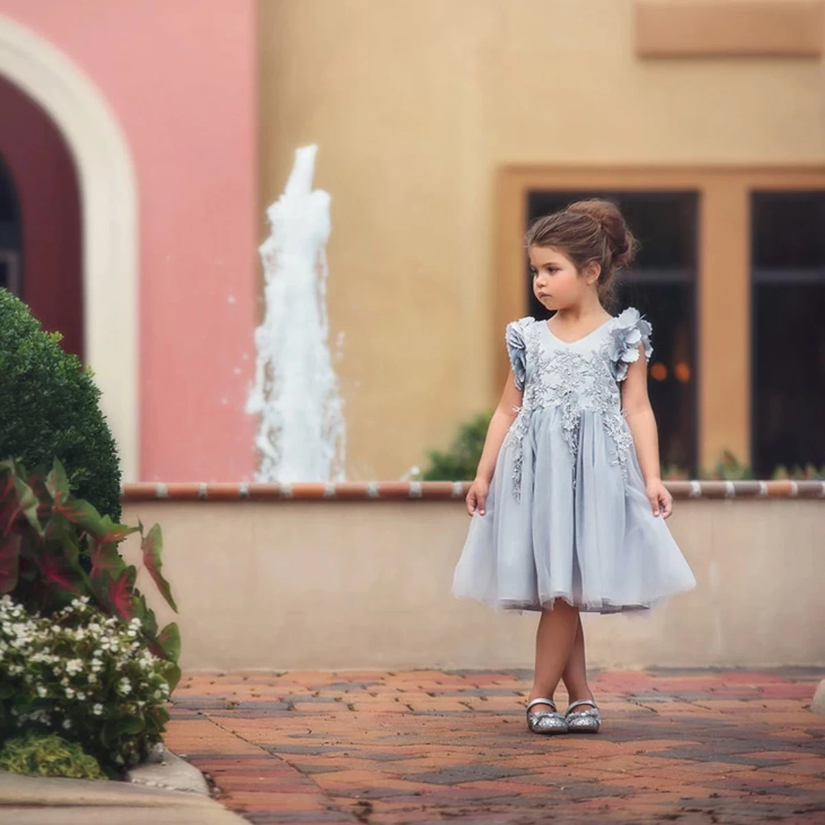Fit for a princess, this dress has it all. Soft silver satin graced with a touch of lace, this dress is a showstopper! Sleeves are embellished with whimsical die cut flowers that will have all eyes on her. Tulling overlay skirt adds just the right touch of fullness and twirl. Fully lined with soft cotton, back zip. 100% poly self, 100% cotton lining. Machine wash, hang dry.