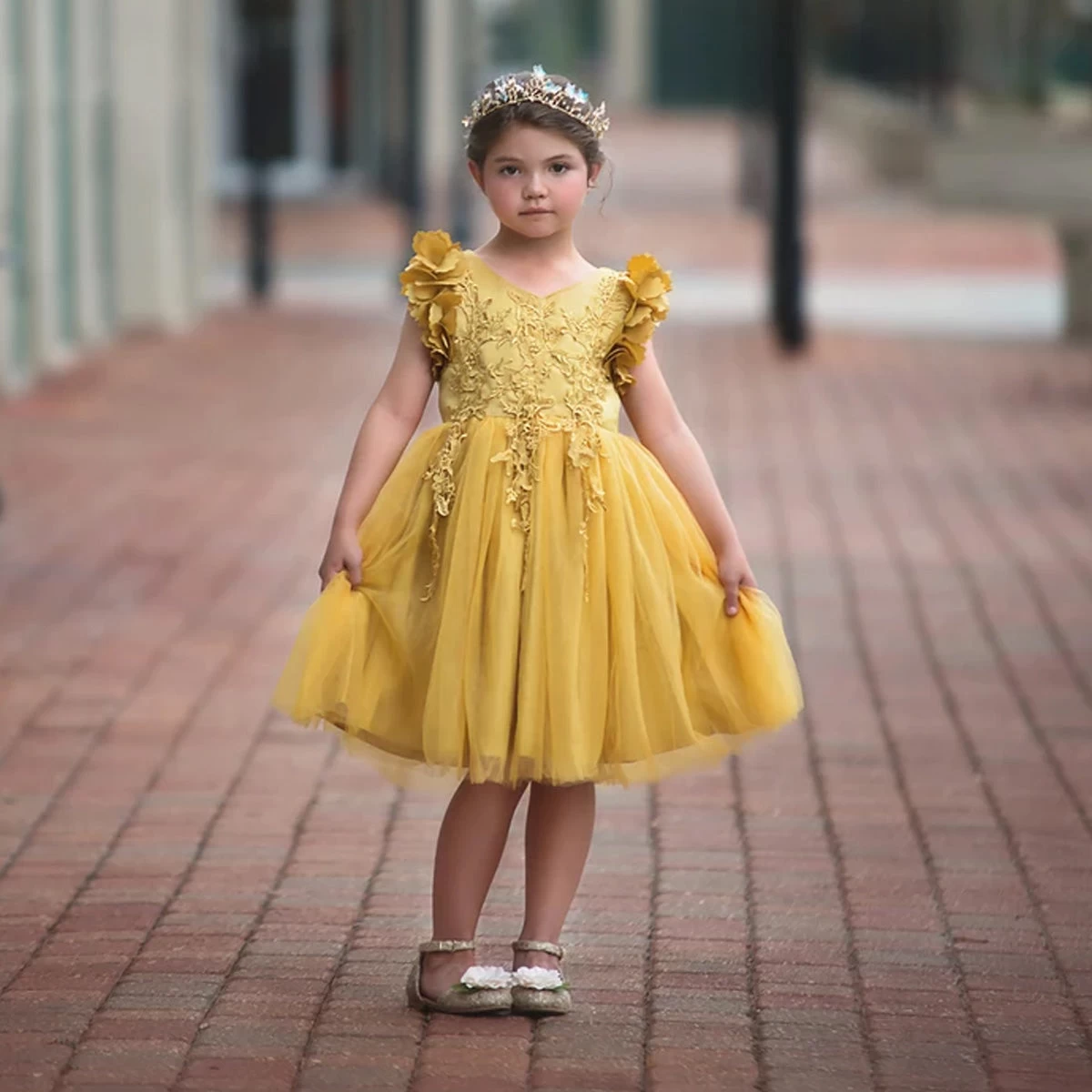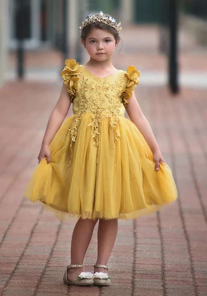 Fit for a princess, this dress has it all. Â Soft mustard satin graced with a touch of lace, this dress is a showstopper! Â Sleeves are embellished with whimsical die cut flowers that will have all eyes on her. Â Tuling overlay skirt adds just the right touch of fullness and twirl. Â Fully lined with soft cotton, back zip. Â 100% poly self, 100% cotton lining. Machine wash, hang dry.