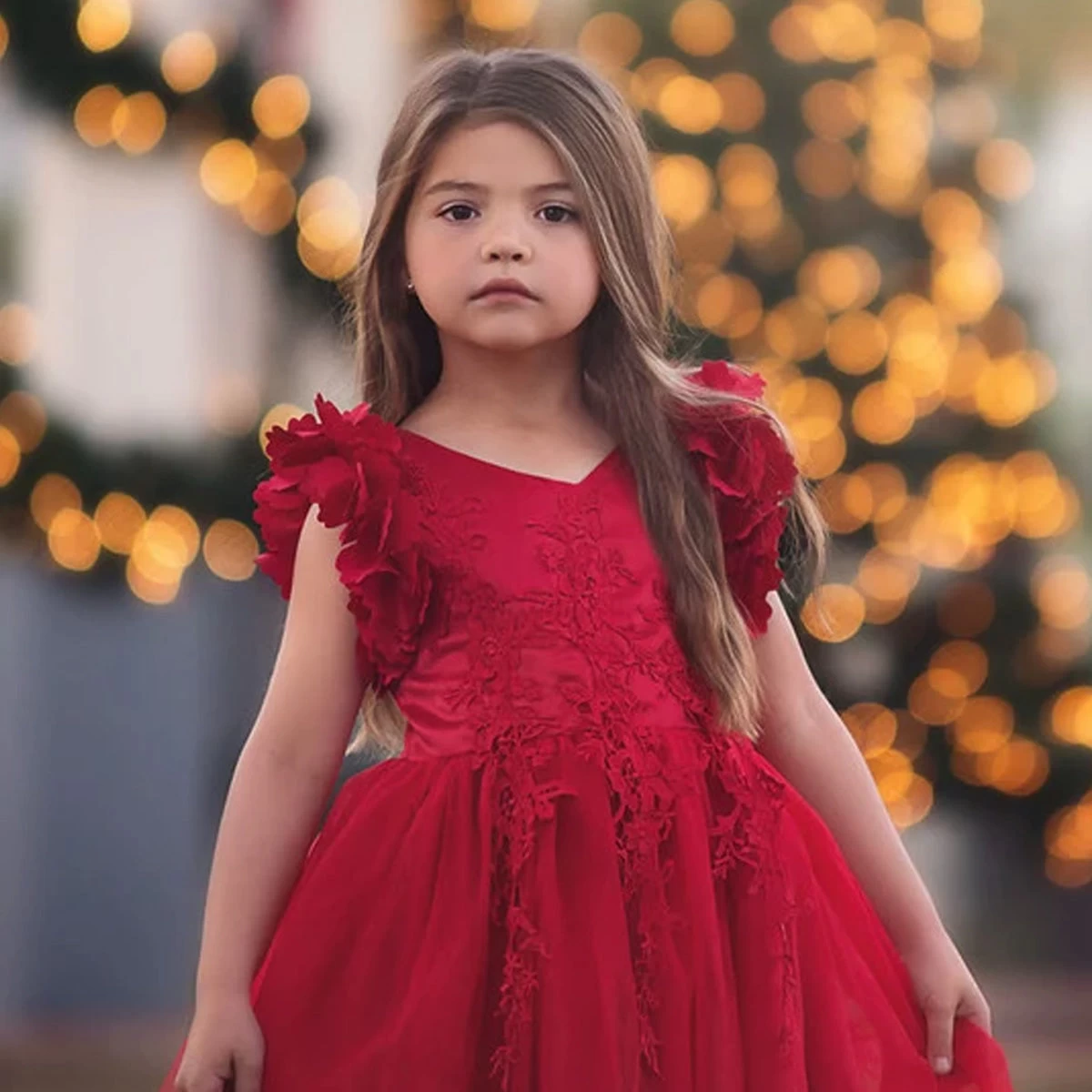 Fit for a princess, this dress has it all. Regal crimson satin graced with a touch of lace, this dress is a showstopper!  Sleeves are embellished with whimsical die cut flowers that will have all eyes on her. Tulling overlay skirt adds just the right touch of fullness and twirl. This is a gorgeous full length gown and incredible value for a gown of this caliber.  Fully lined with soft cotton, back zip. 100% poly self, 100% cotton lining. Machine wash, hang dry.