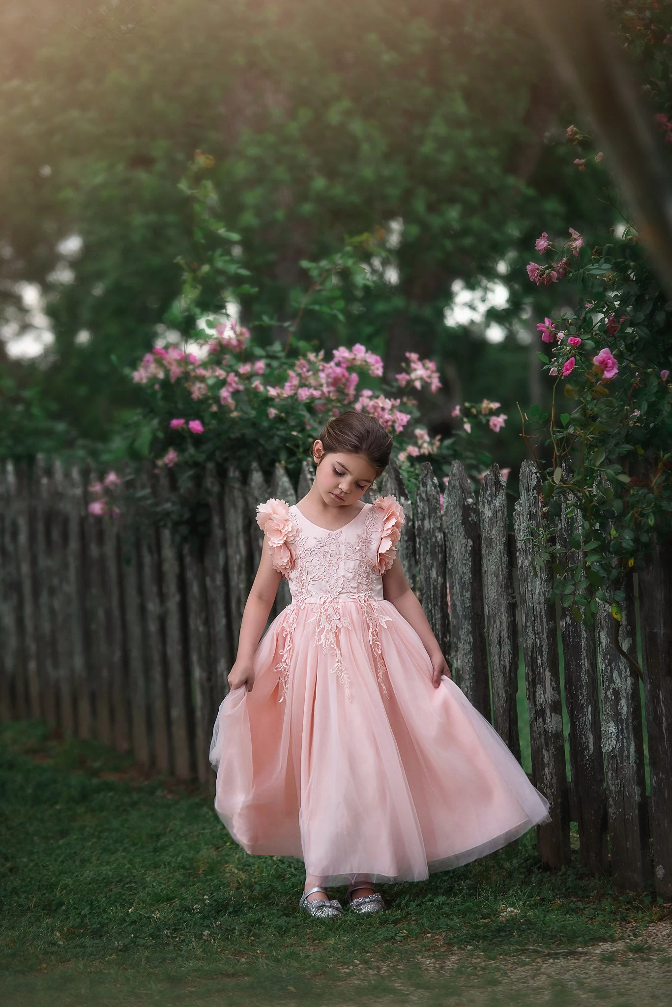 Fit for a princess, this dress has it all. Regal blush pink satin graced with a touch of lace, this dress is a showstopper!  Sleeves are embellished with whimsical die cut flowers that will have all eyes on her. Tulling overlay skirt adds just the right touch of fullness and twirl. This is a gorgeous full length gown and incredible value for a gown of this caliber.  Fully lined with soft cotton, back zip. 100% poly self, 100% cotton lining. Machine wash, hang dry.Â