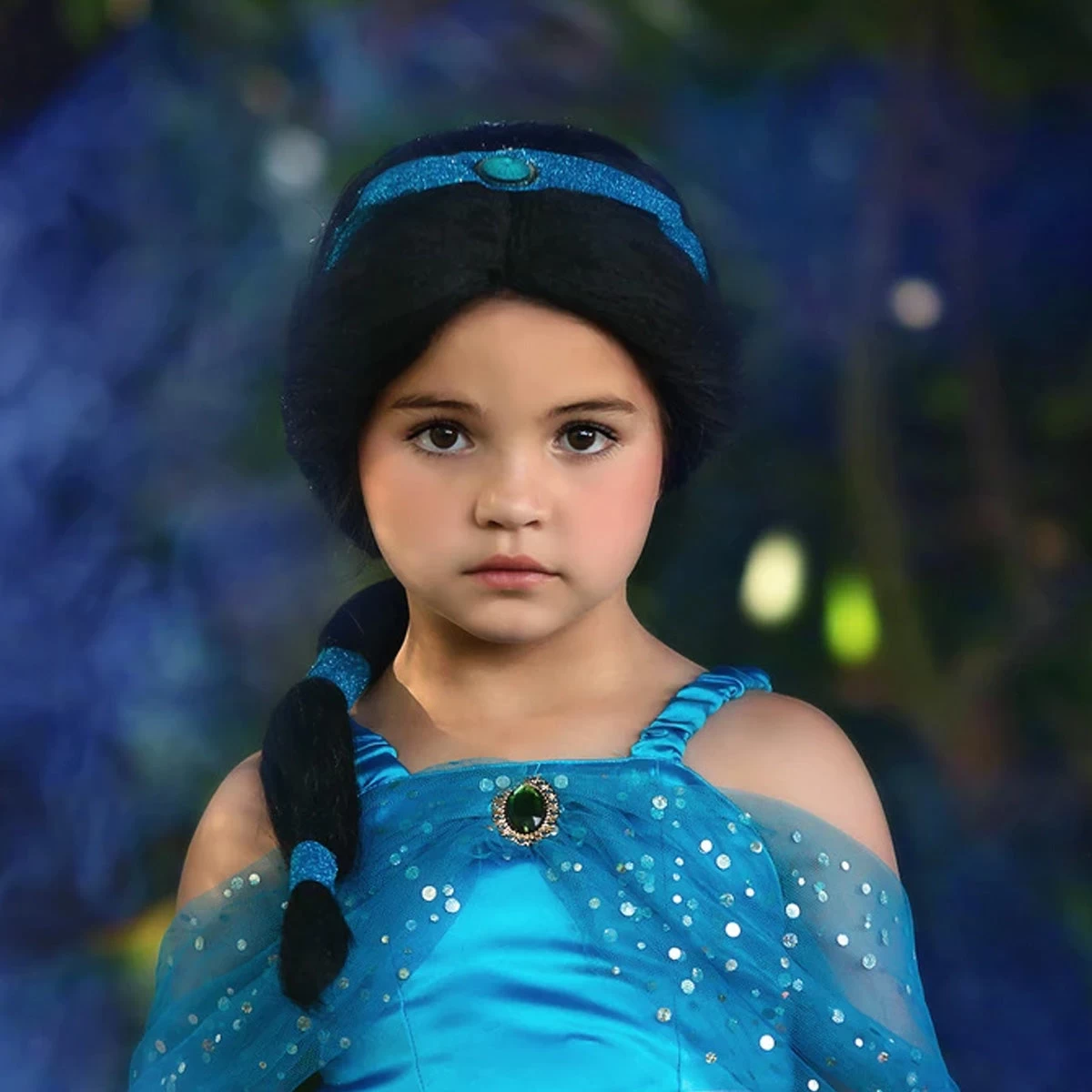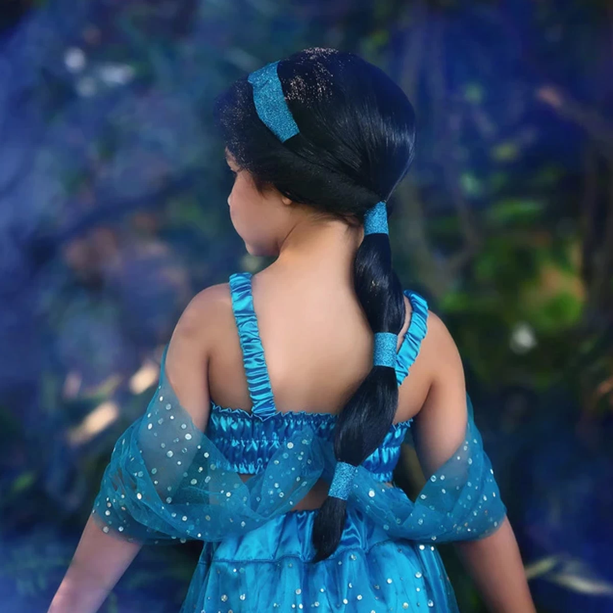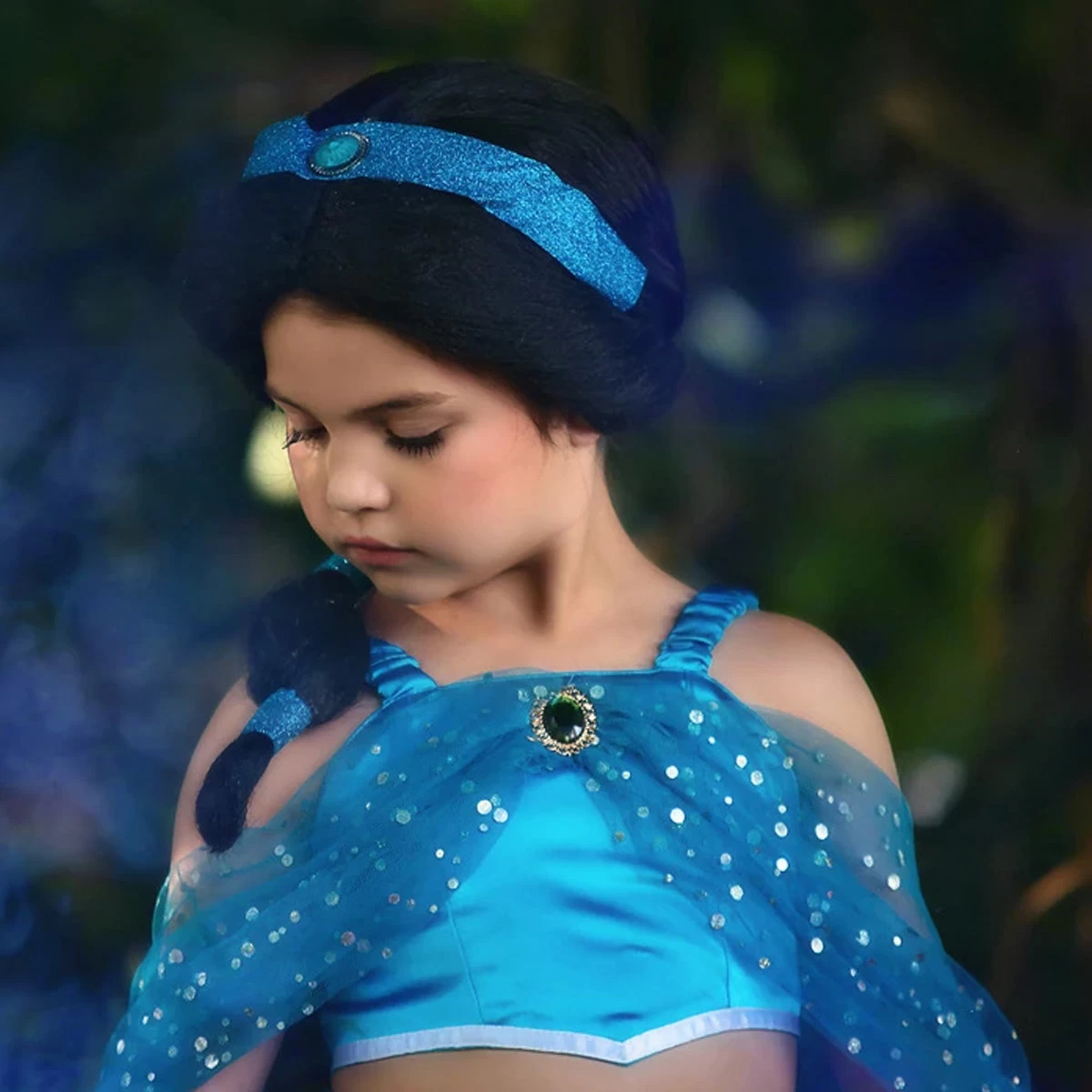 This brunette wig pairs perfectly with our Genie costumes! Long shiny stands are bundled by sparkly blue ties and finished off with a jeweled blue headband. This is so adorable, she will never want to take it off! Like all of our luxe dress up, these are high quality, heirloom pieces that will be enjoyed for years to come. 100% poly.Â