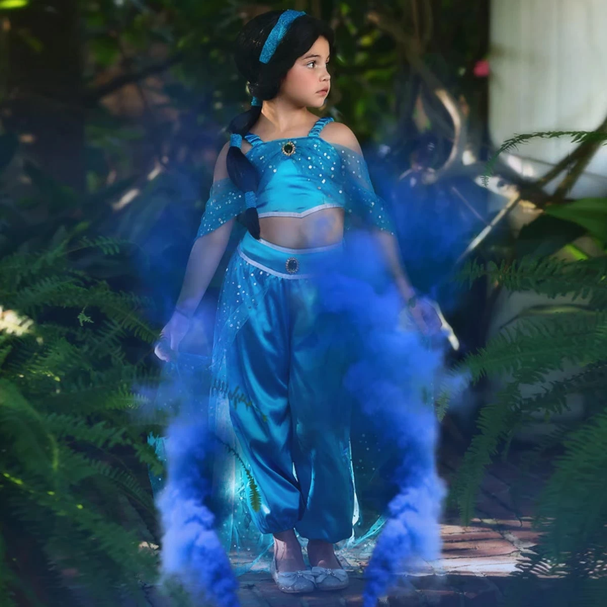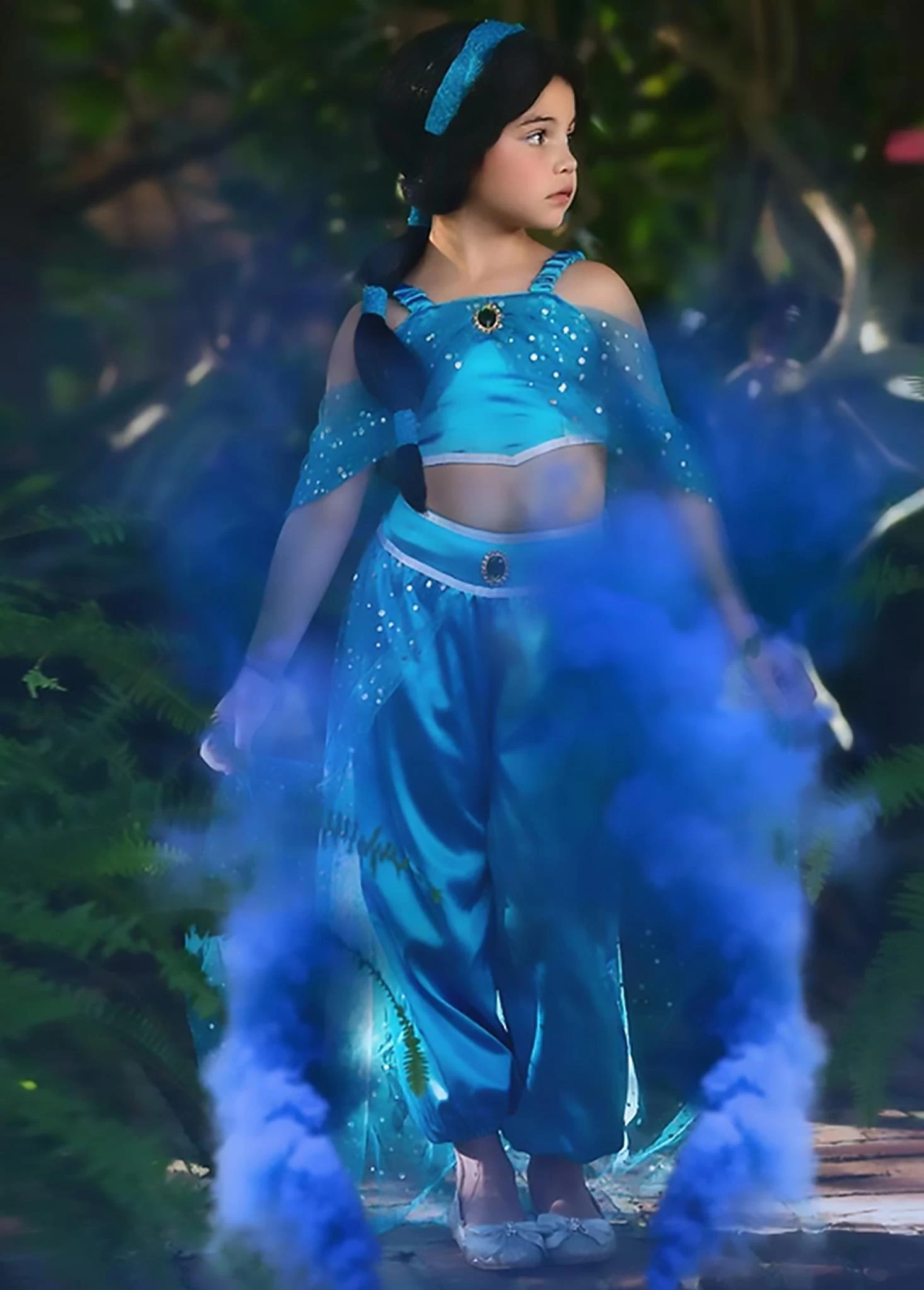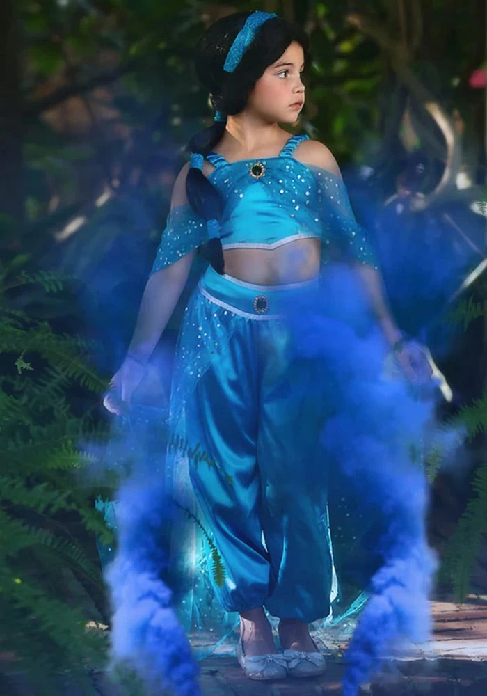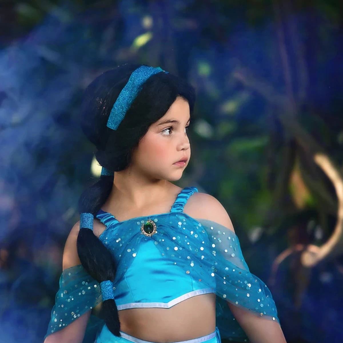 This brunette wig pairs perfectly with our Genie costumes! Long shiny stands are bundled by sparkly blue ties and finished off with a jeweled blue headband. This is so adorable, she will never want to take it off! Like all of our luxe dress up, these are high quality, heirloom pieces that will be enjoyed for years to come. 100% poly.Â
