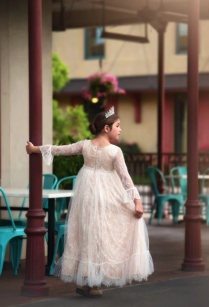 THIS DRESS RUNS ONE SIZE SMALL, WE ADVISE ORDERING UP ONE SIZE This stunning vintage lace gown will have all eyes on her! Our signature French inspired lace with eyelash trim is layered with tuling to create an oh so girly twirly frock! This gown is fully lined with soft cotton and our signature soft lace and fabrications are perfect for the most tactile sensitive child. She will never stop twirling! 100% poly self, 100% soft cotton lining. Machine wash, hang dry.Â