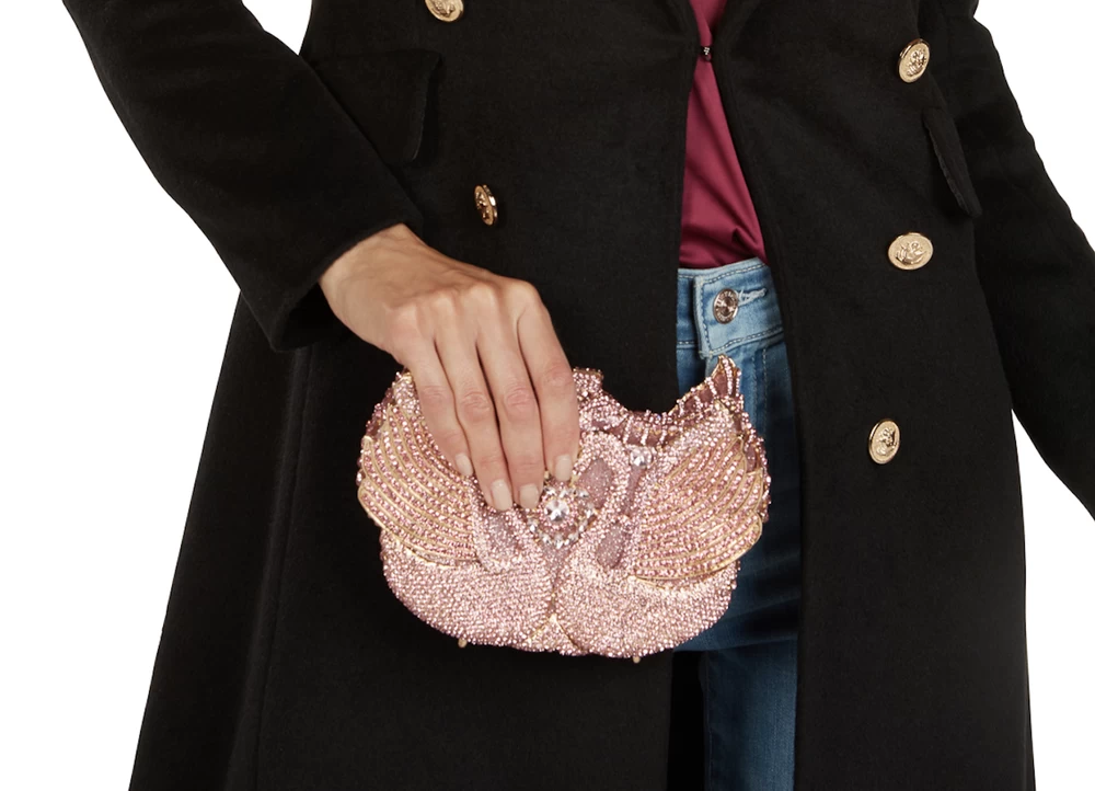An alloy metal outer is adorned with stunning pink jewels and finished with a removable dainty chain and a clasp-top closure.