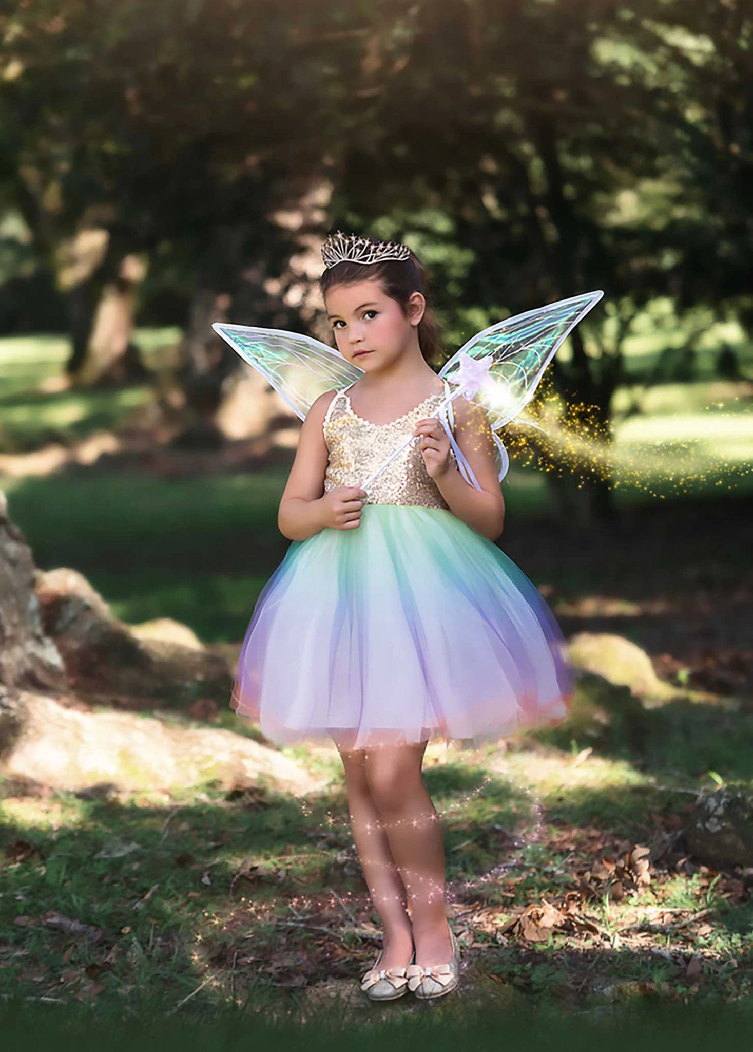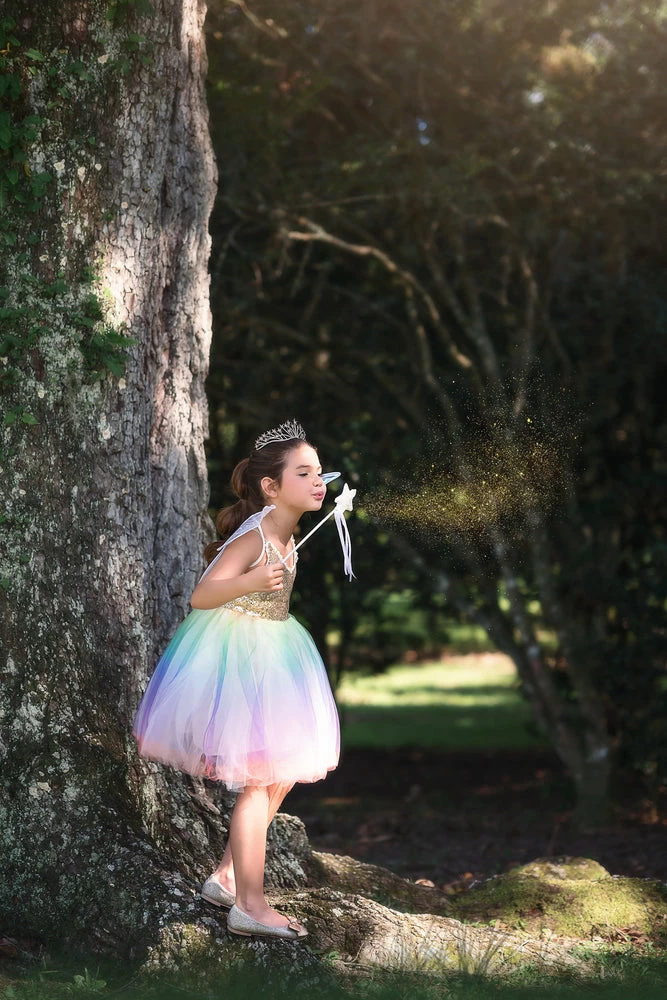 This darling fairy will have all eyes on her! The gold sequin bodice is perfectly trimmed with dainty cotton crochet, while the rainbow tuling skirt has just the right poof, for the girl and her twirl! The green sparkle wings are glitter free and elastic attachable for just the right fit. This adorable look is finished off with a white sequin wand for a magical outfit she won’t ever want to take off! The dress is fully lined with soft cotton. Machine wash, hang dry.Â