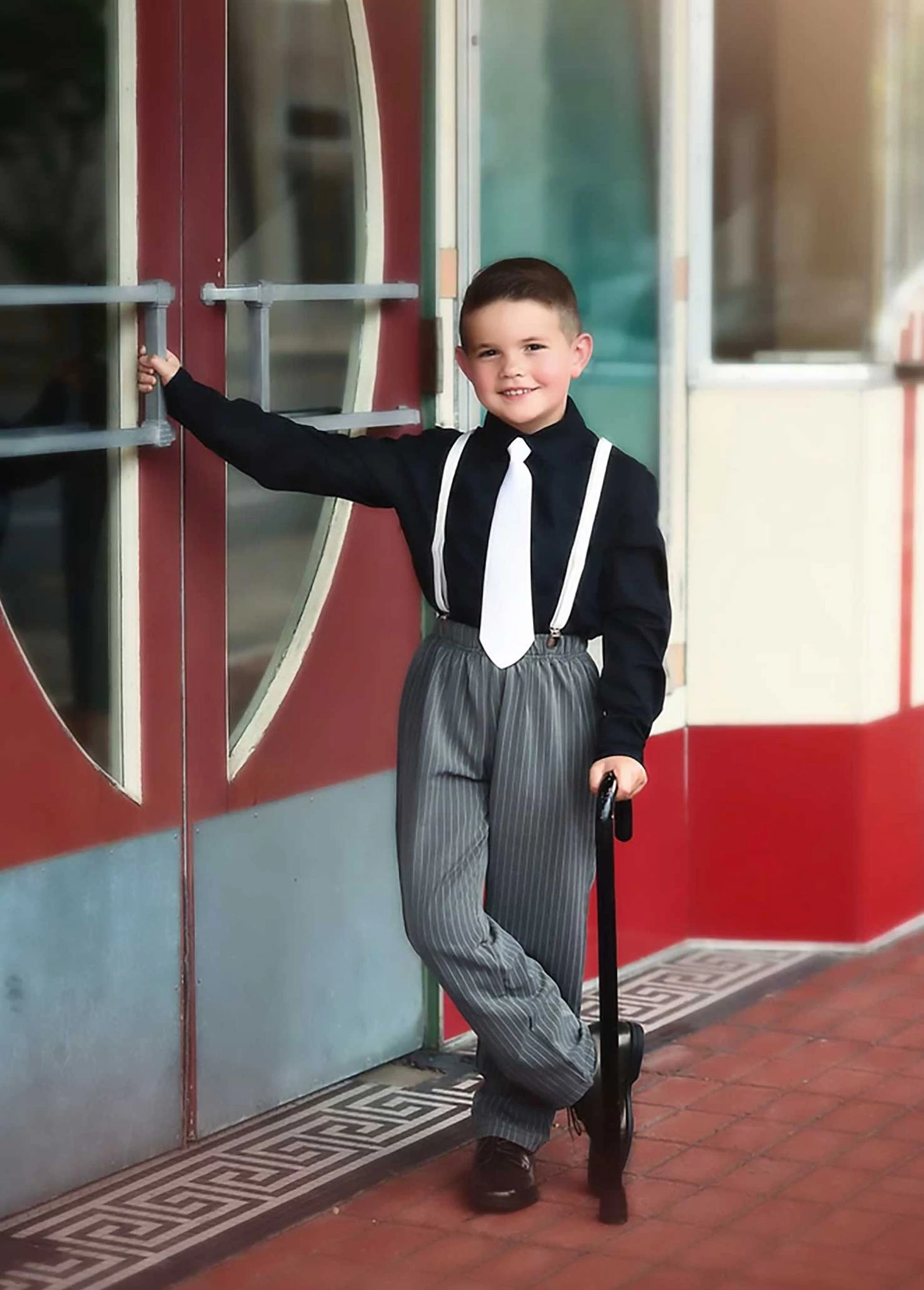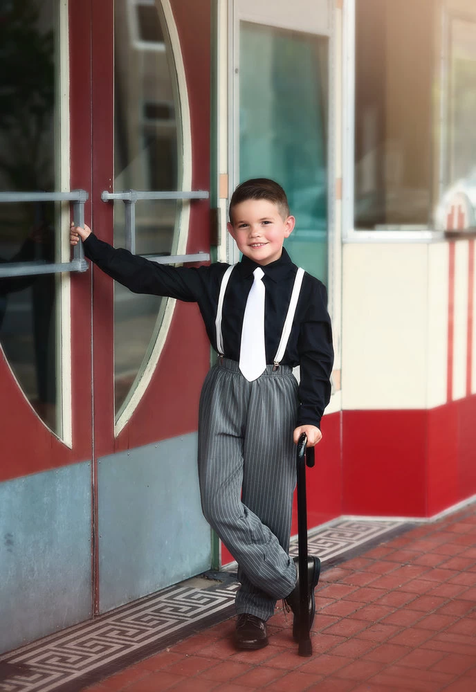 Mr. Zoot Suit will have all eyes on him! The 4pc. set is made up of the grey pinstripe pant, black button front shirt, white suspenders and white tie. Pair him with our Gatsby girls for the perfect squad photos!