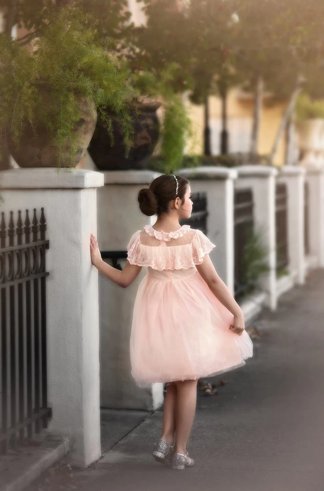 Soft and perfectly elegant for her most special of occasions, the Giovanna dress will have all heads turning. Â Layers upon layers of tulling grace the skirt of this oh so twirly dress, while a soft flounce of lace completes the neckline. Â This dress is lined with pure cotton. Â Back zip. Â Machine wash, hang dry. Â 100% poly self, 100% cotton lining.