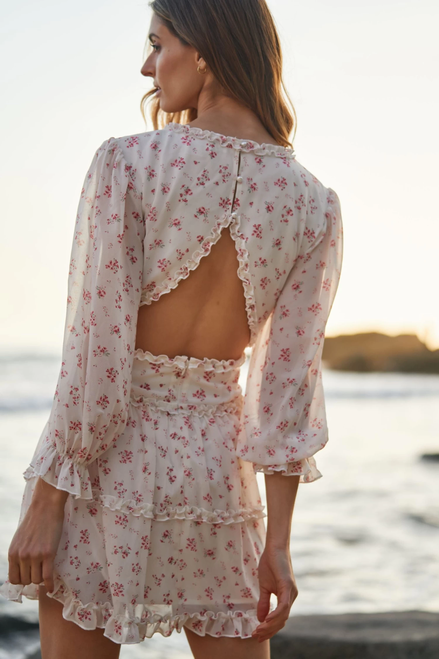 We suggest ordering up one size. Our most darling mini to date! The perfect Summer frock, a perfect choice for weddings or a night out on the town. A deep-v is complimented by sweet ruffles, gathered sleeves, and an open back finished with delicate buttons.