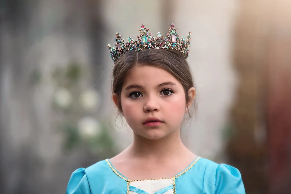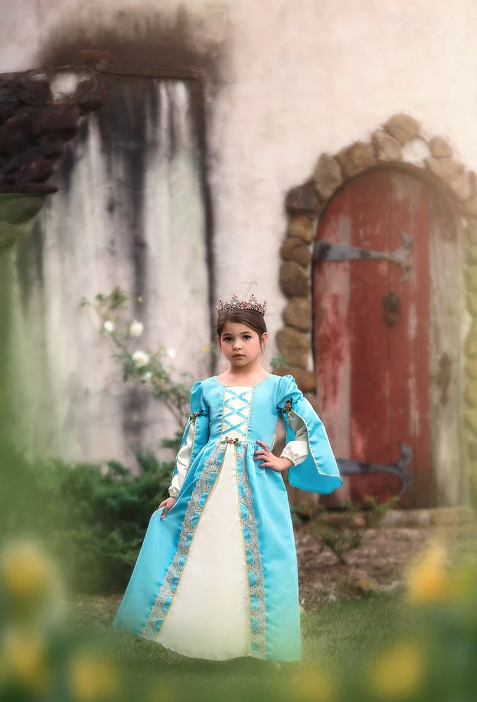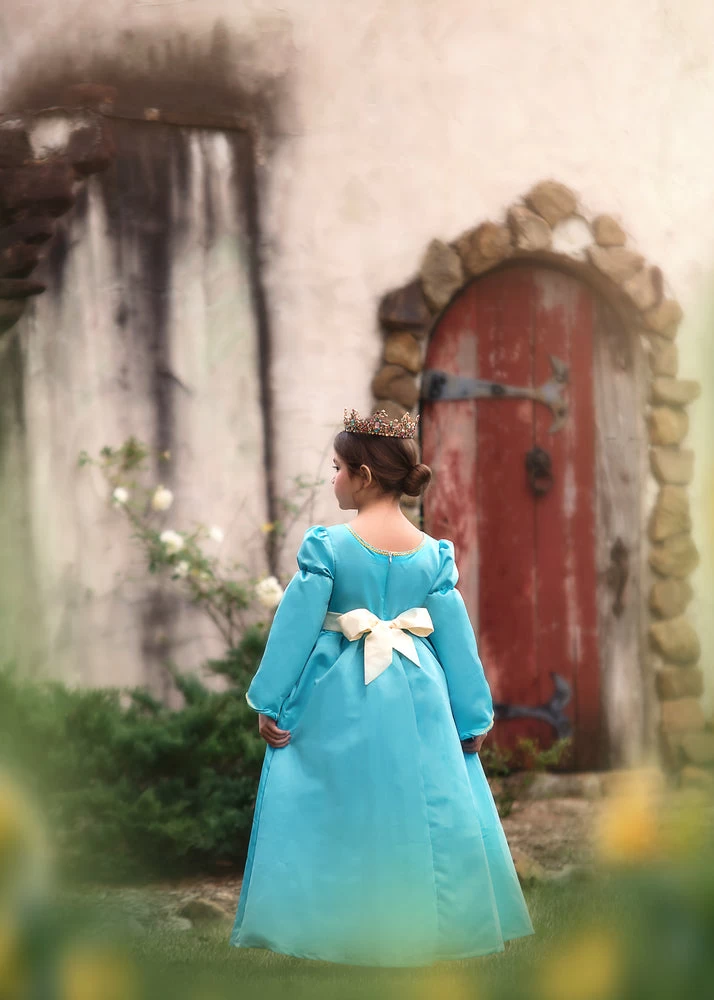 One of our most royal dresses to date, she will have so much fun wearing this one! Not a detail left untouched, the soft blue satin is graced with gold trimmings and flower detailing. The sleeves are pure royalty full of pomp and circumstance. This gorgeous gown self ties in back, for just the right fit! Fully lined with soft cotton, never itchy and like all of our products, NO glitter EVER!