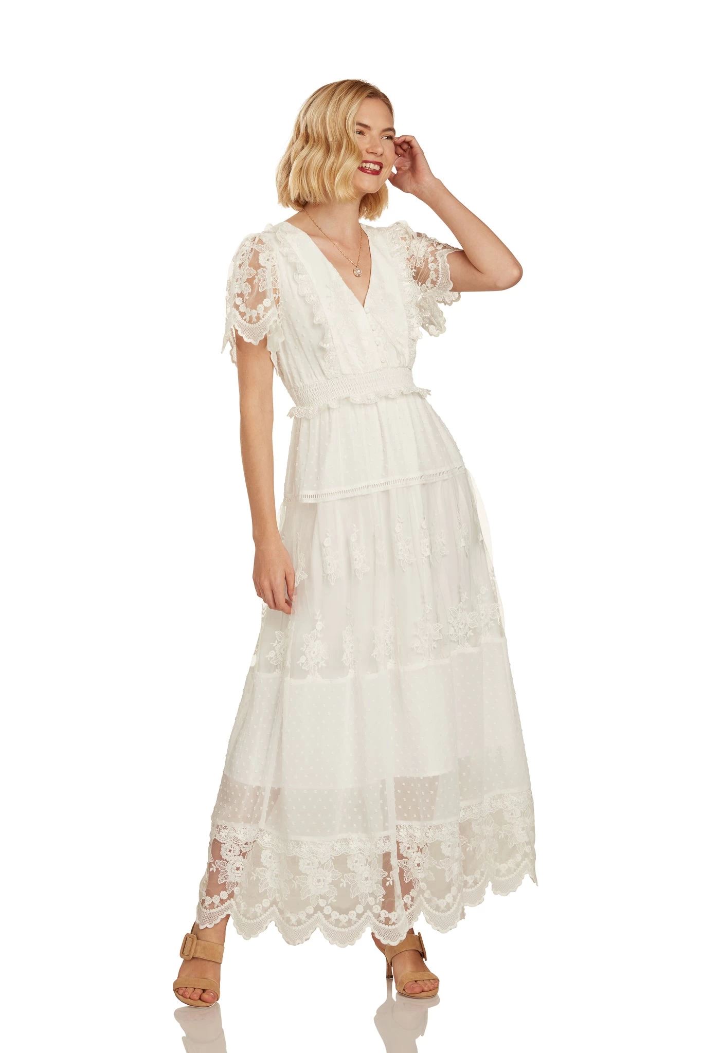 A must have in your Spring wardrobe! A delicate dot fabric meets sweet embroidery and trims, subtle ruffles, and finished with a cap sleeve adorned with gorgeous lace. A feminine v-neck is finished with delicate buttons. A perfect choice for beach, dinner, party or photoshoot. Gorgeous coming and going! Â