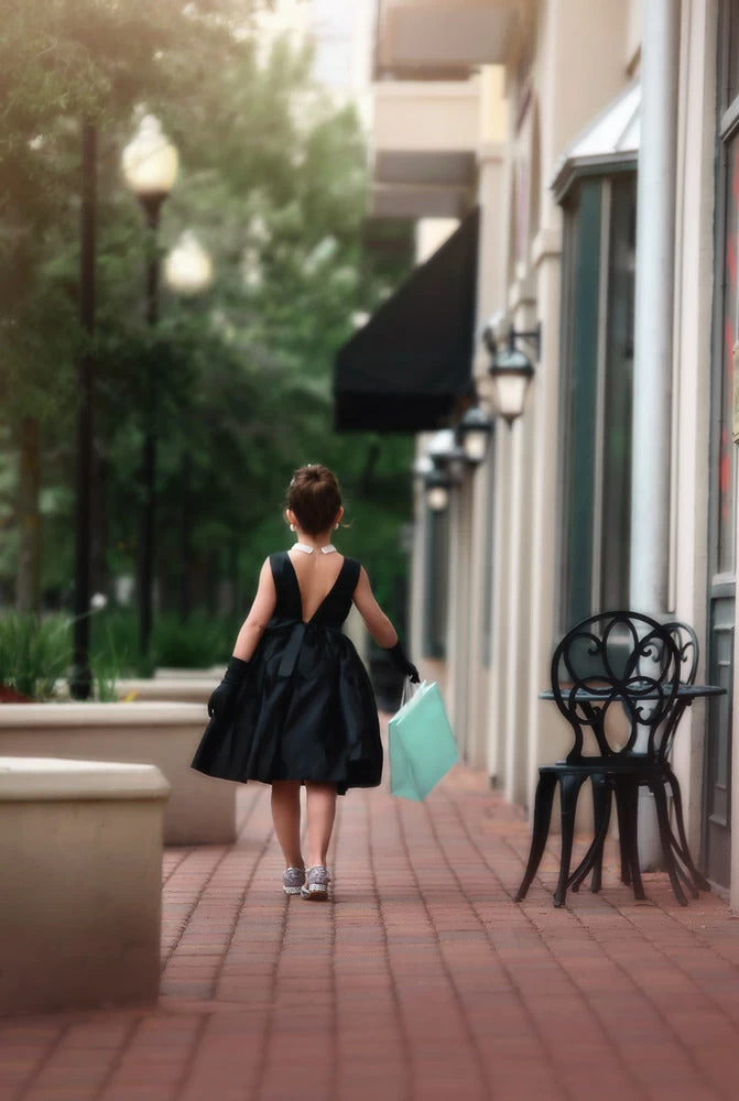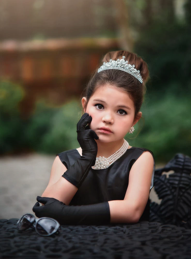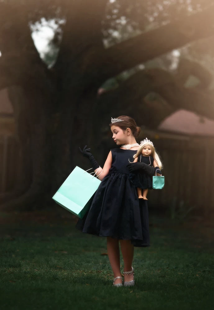 She will be ready for breakfast, dinner or the theatre wearing this super chic outfit! There’s nothing left out, everything you need is included: The little black dress, the black gloves, the tiara, the necklace & earrings set, the chic black sunglasses and the shopping bag! The dress is awesome quality and comes with a sweet V back and self ties for just the right fit. The little black dress is fully lined with the same blue cotton as her shopping bag. Our jeweled shoes are sold separately. This set is to die for! DON’T FORGET HER MATCHING DOLL DRESS!