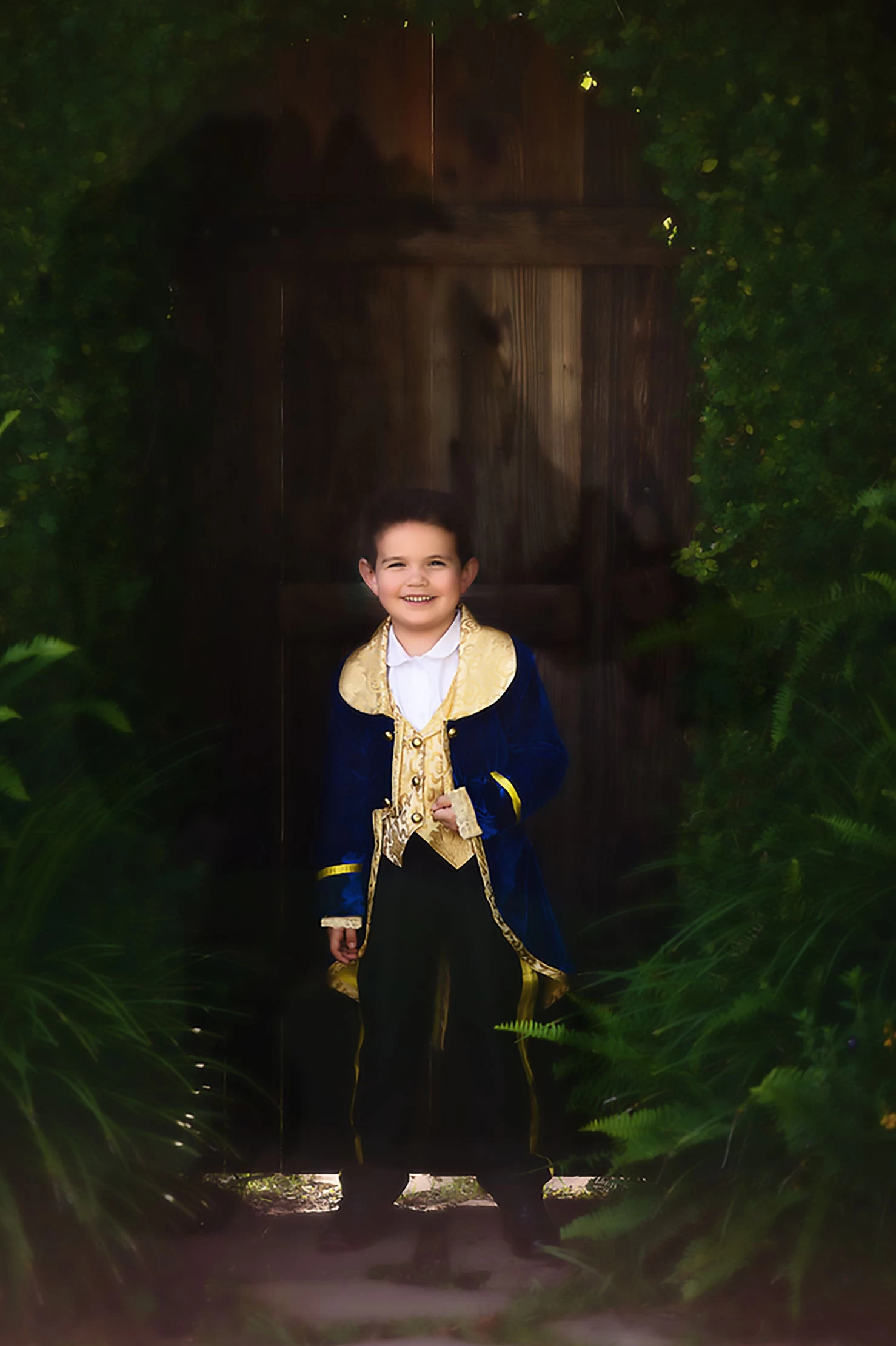 This luxe costume will have all eyes on HIM! This 4 pc. set includes the velvet jacket, the vest, pant and shirt.  The velvet jacket in all of it’s splendor and trimmings, has formal tails and perfectly lined with gold jacquard fabric. The jacquard vest is finished off with gold buttons. The striped tuxedo pant has an elastic waist for just the right fit. The button front shirt is finished off with dapper lace cuffs, reminiscent of 18th century royalty. Truly an amazing keepsake that will not disappoint. 100% poly, machine wash, hang dry.