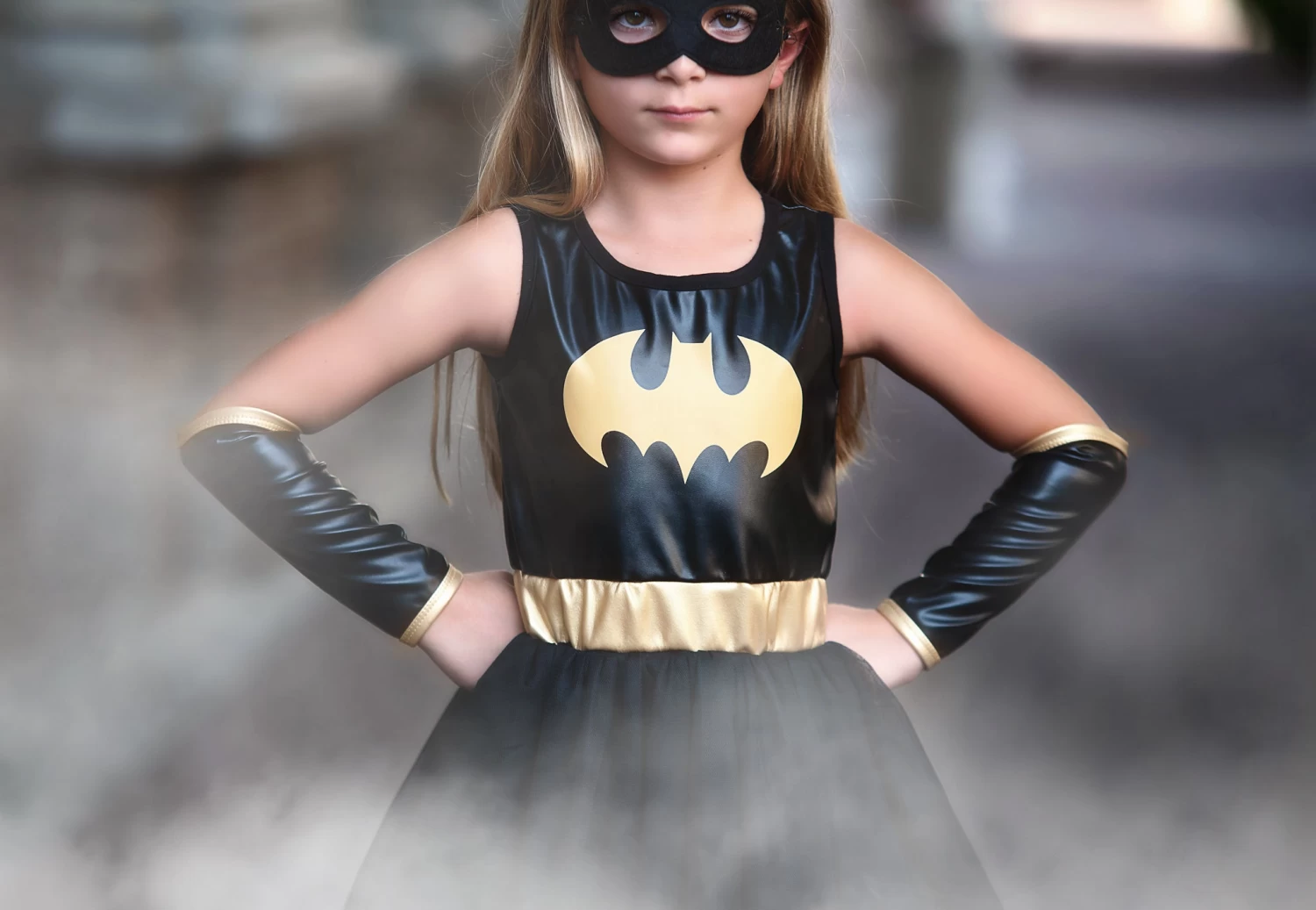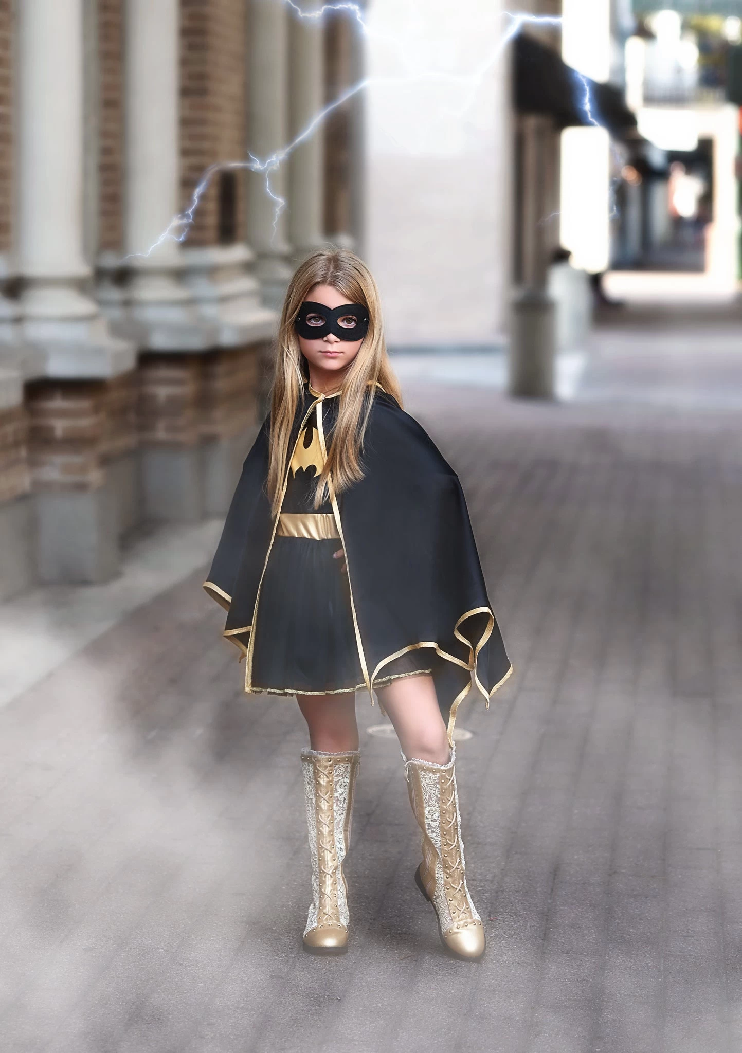 The Bat Queen has arrived and she’s oh-so-sassy. This darling 4-piece set features a dress, cape, glovettes and mask.Â